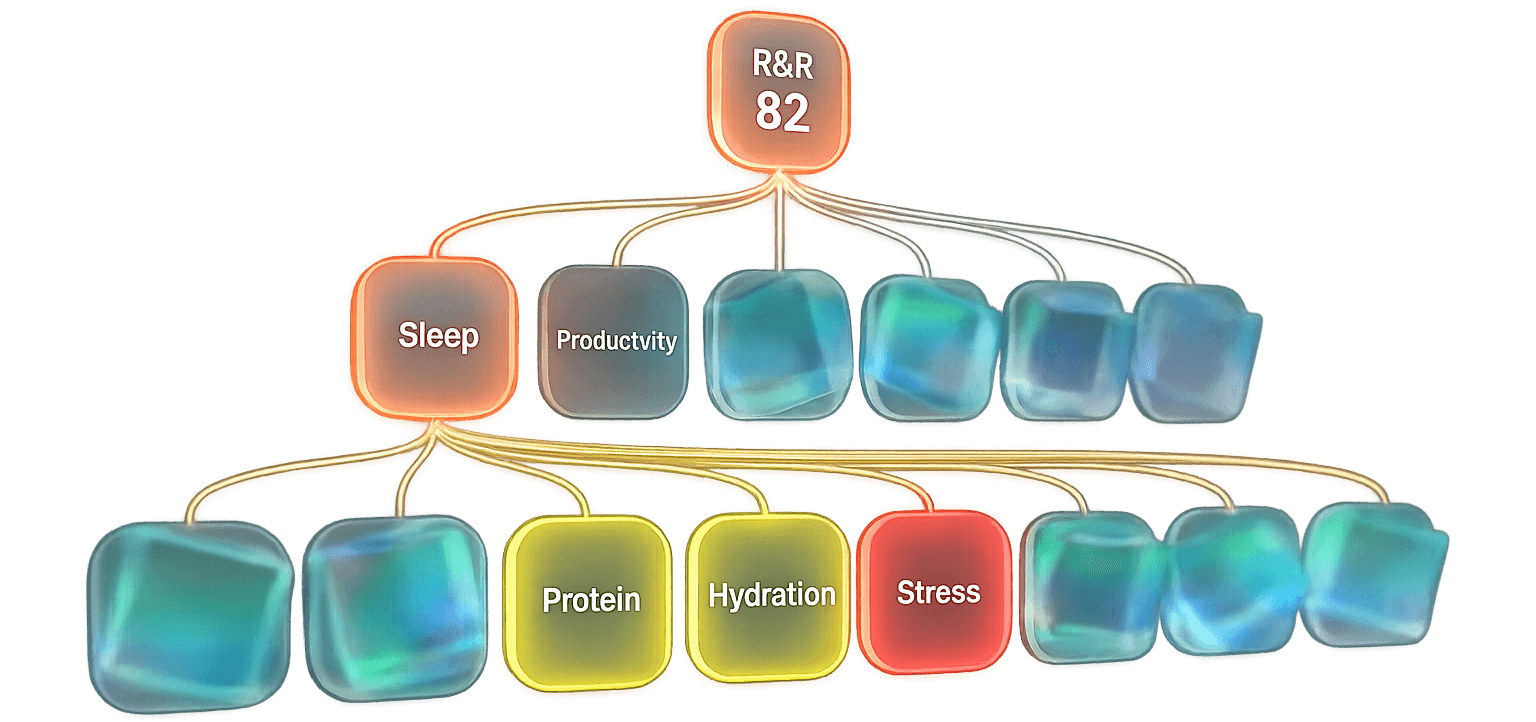 Today, Elena's R&R score sits at 82, glowing with a soft orange hue. This isn't an alarm. It is an invitation to explore. Elena taps the score, and the interface seamlessly expands downward into a branching glass hierarchy to reveal the foundational metrics driving her day. She immediately sees that out of all her sub-scores, her physical Sleep metric is the one glowing orange. She taps deeper into Sleep. The interface isolates the root causes: her Protein and Hydration metrics are glowing a cautionary yellow, while her Stress metric pulses a vibrant red.