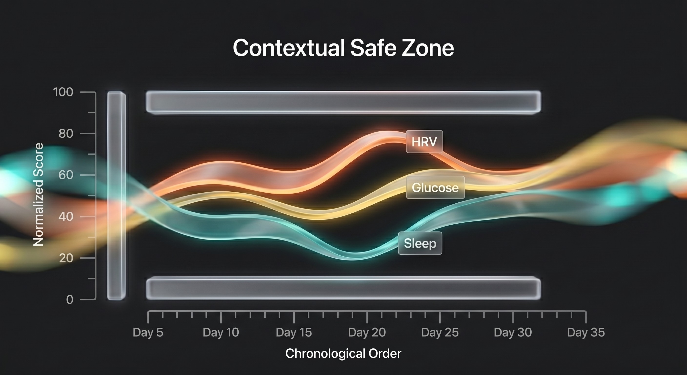 We look beyond raw numbers. By continuously monitoring foundational markers like Heart Rate Variability, glucose trends, and sleep architecture, the engine establishes Elena's unique upper and lower physiological limits. This defined space is her Living Health Corridor. As long as her metrics flow smoothly within these boundaries, she is building sustainable momentum.